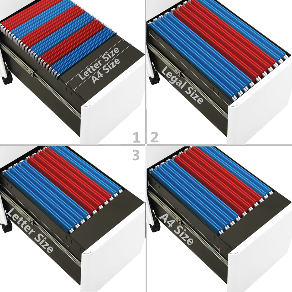 Dette kontorskab er lavet af stål, hvilket gør det holdbart samt let at rengøre. Med 3 skuffer og 1 lås giver dette arkivskab dig mulighed for at sortere dine mapper pænt i forskellige kategorier og opbevare dine dokumenter et sikkert sted. Hver skuffe er udstyret med en aftagelig stang, som frit kan kombineres til opbevaring af dokumenter i standardstørrelserne Letter, Legal og A4-hængemapper. Det mobile skab har en pennebakke, hvilket kan gøre dit skrivebord mere ryddeligt. Skufferne med kuglelejeskinner sikrer nem åbning og lukning, og de kan trækkes helt ud, selv under øget belastning. Skabets venstre og højre hjørner er desuden runde.