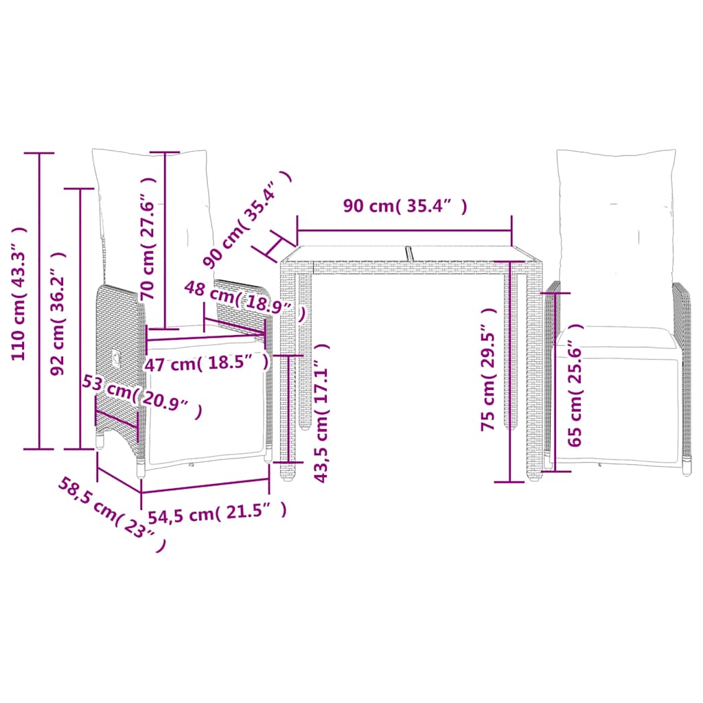 bistrosæt til haven 3 dele med hynder polyrattan sort