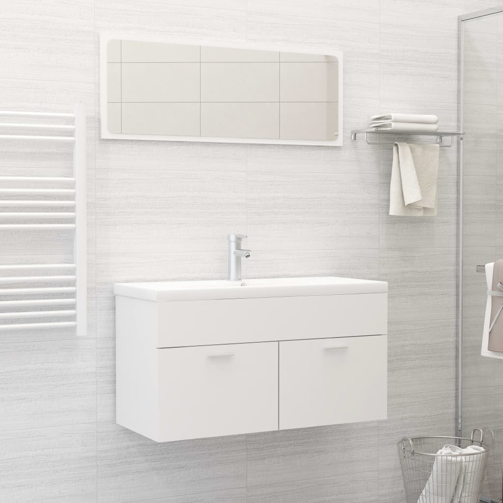 Dette stilfulde badeværelsesmøbelsæt, der består af et vaskeskab, et indbygget håndvask og et spejl, passer perfekt til dit badeværelse eller vaskerum med sit flotte udseende og rene linjer.