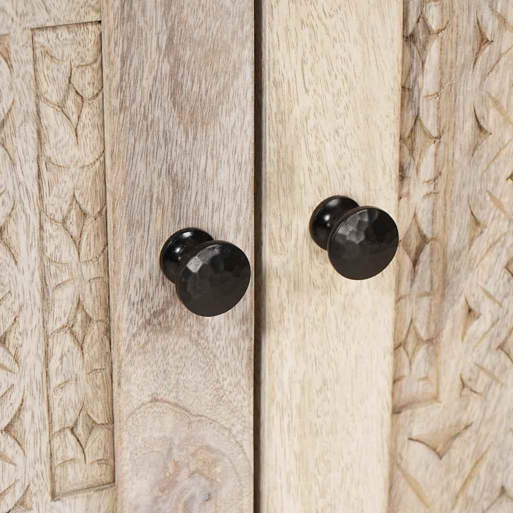 • Stilfulde Knopper og Fødder: Skabets knopper og firkantede ben har en lækker sort finish, der ser fed ud i kontrast til træets naturlige farver. Denne stilfulde detalje tilføjer til den rustikke fornemmelse, mens det stadig holder sig moderne.