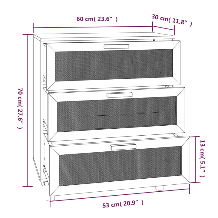 • God opbevaringsplads: Kommoden er forsynet med 3 skuffer, så den tilbyder rigelig med plads til at holde dine forskellige ting og sager pænt organiseret og inden for nem rækkevidde. Designet med vævet, naturlig rattan på skufferne tilføjer ekstra skønhed.