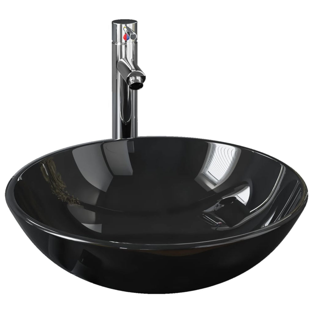 håndvask til badeværelse m. hane og bundventil hærdet glas sort